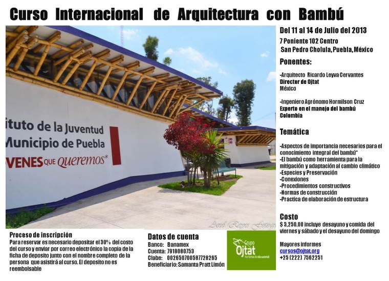 Le agradezco el favor de promocionar a traves internet el Curso Internacional De arquitectura con Bambu que se desarrollara del 11 al 16 de Julio en Puebla, Mexico. En Dicho Curso es invitado magistral el Ingeniero Agronomo Colombiano Hormilson Cruz Rios para que haga exposiciones sobre cultivo de los bambues, aspectos economicos de los cultivos, producciones, generacion de biomasa segun la especie de bambu, bambues recomendados para generacion de biomasa considerando aspectos economicos de rentabilidad, madera ingeneirizada, produccion industrial de pellets y co-generacion de energia utilizando biomasa de bambu lograndose su alto poder calorifico.