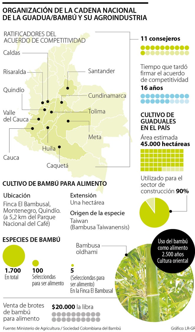 En enero de este año, el ministerio de Agricultura y Desarrollo Rural, mediante la resolución No. 000009 creó el ‘Consejo Nacional de la cadena productiva de la guadua/bambú’ lo que lo constituye como un cuerpo consultivo del Gobierno Nacional en política pública para el subsector y concertador entre los eslabones de la cadena.