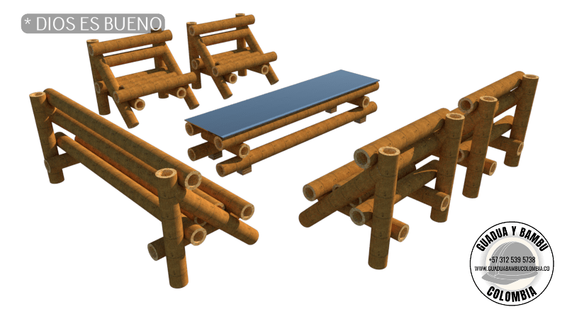 Esta es una sala diseñada con bambú guadua variedad castilla que es la más gruesa, entre cepa y basa que es lo más estructural y fuerte, inmunizada con C5B: *Composición:* Inmunizante C5B está formado por compuestos de Boro, Cobre y Cromo, debidamente balanceados, su composición de diseño es: . Cromo Cro3 40% a 45 % que actúa como fijador del inmunizante en la madera. . Cobre CuO 15% a 19 % y actúa como fungicida. . Compuestos de boro H3BO3 38% a 42% actúa como Insecticida.
