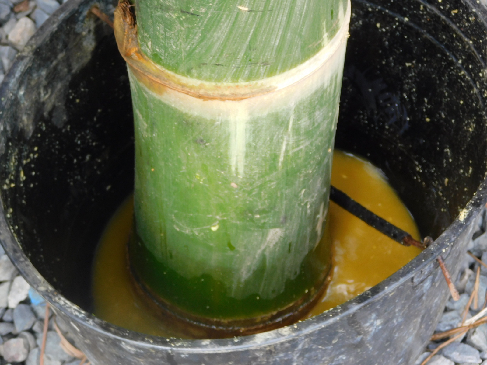 Desplazamiento de savia: La presión fuerza al líquido a salir por los puntos de purga y desaloja la savia, permitiendo una impregnación profunda del conservante en la estructura del bambú.
