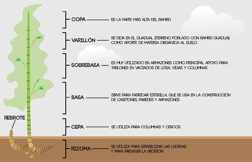 - Al usar bambú guadua en sus construcciones, lo más estructural que tiene una planta es de la mitad para abajo = cepa y basa; de la mitad para arriba = sobre basa, varillón y copa se usa para hacer esterilla, ventanas, puertas o detalles no estructurales.