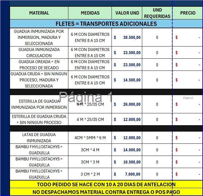 DIFERENTES CALIDADES DE GUADUA 6 METROS* diámetros entre 08 a 15 cm – *la guadua de Inmersión sale de Cerritos Pereira, e inyección sale de Calarcá Quindio; cruda/natural sale de las diferentes fincas de aprovechamiento donde esté la orden forestal.