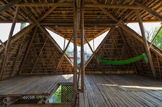 El techo de la casa de bambú es quizá el elemento constructivo mas importante de la casa junto a las bases, el techo se cierra y abre de acuerdo al clima local, su forma triangular diametralmente colocada al ingreso le da carácter a estacasa ecológica.