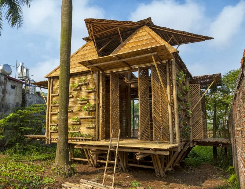 Ingreso principal de la casa de bambú, se puede ver sus sólidas bases elevadas del mismo material