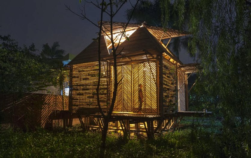 La casa resplandece desde el interior en la oscuridad de la noche, debido a las juntas del bambú
