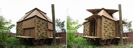 Casa de bambú cerrada cuando hay mal tiempo y a la derecha completamente abierta para el ingreso de luz y ventilación